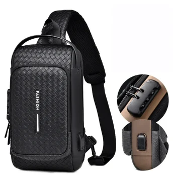 Men Fashion Chest Bag Anti-theft Tape Bag Portable Backpack with USB Charging Port Male PU Shoulder Outdoor Sports Crossbody Bag