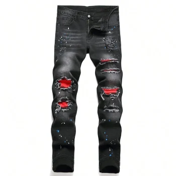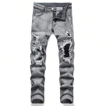 Men y2k Stretchy Skinny Denim Jeans For Men Casual pants Ripped Patchwork Hole Slim Fit Denim Hip Hop Black Straight Trousers