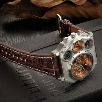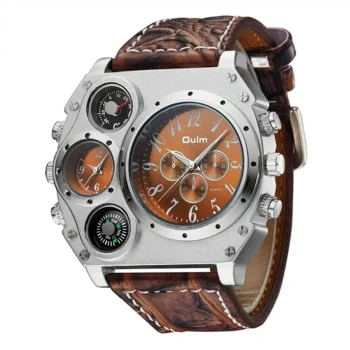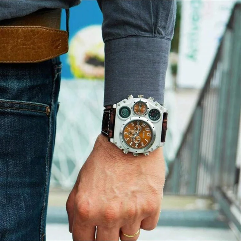 Oulm Fashion Casual Men’s Watch Night Light Dual Time Zone Large Dial Leather Strap Men’s Quartz Watch reloj hombre