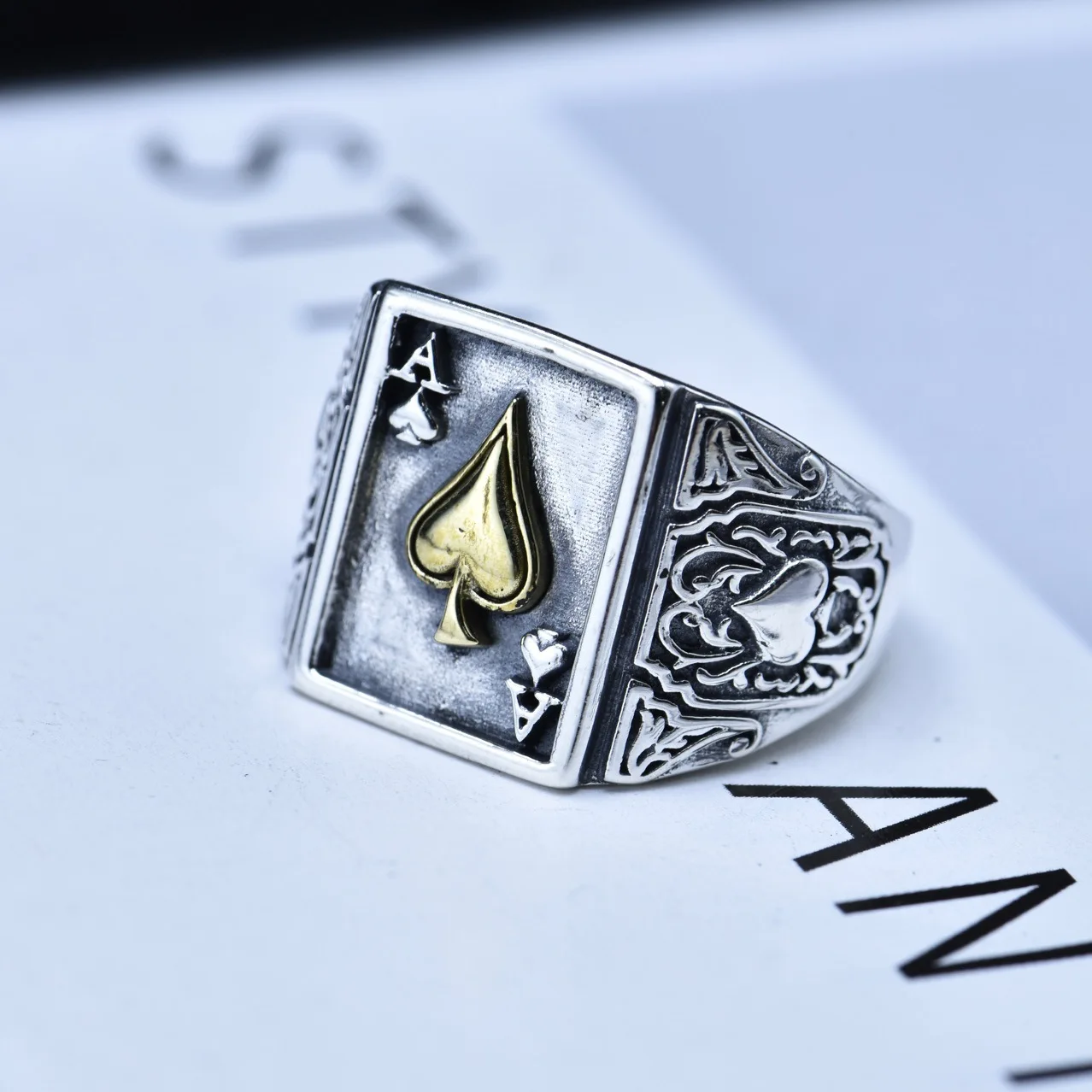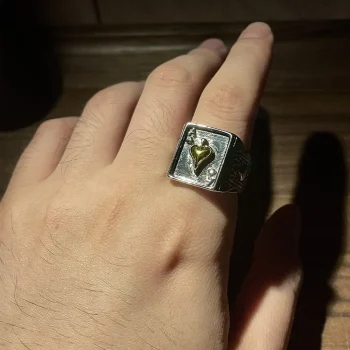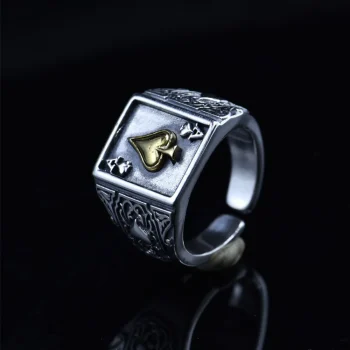 Muito bom. Parecido com a foto. Material redistente e com peso. A abertura atras permite colocar em vários dedos.