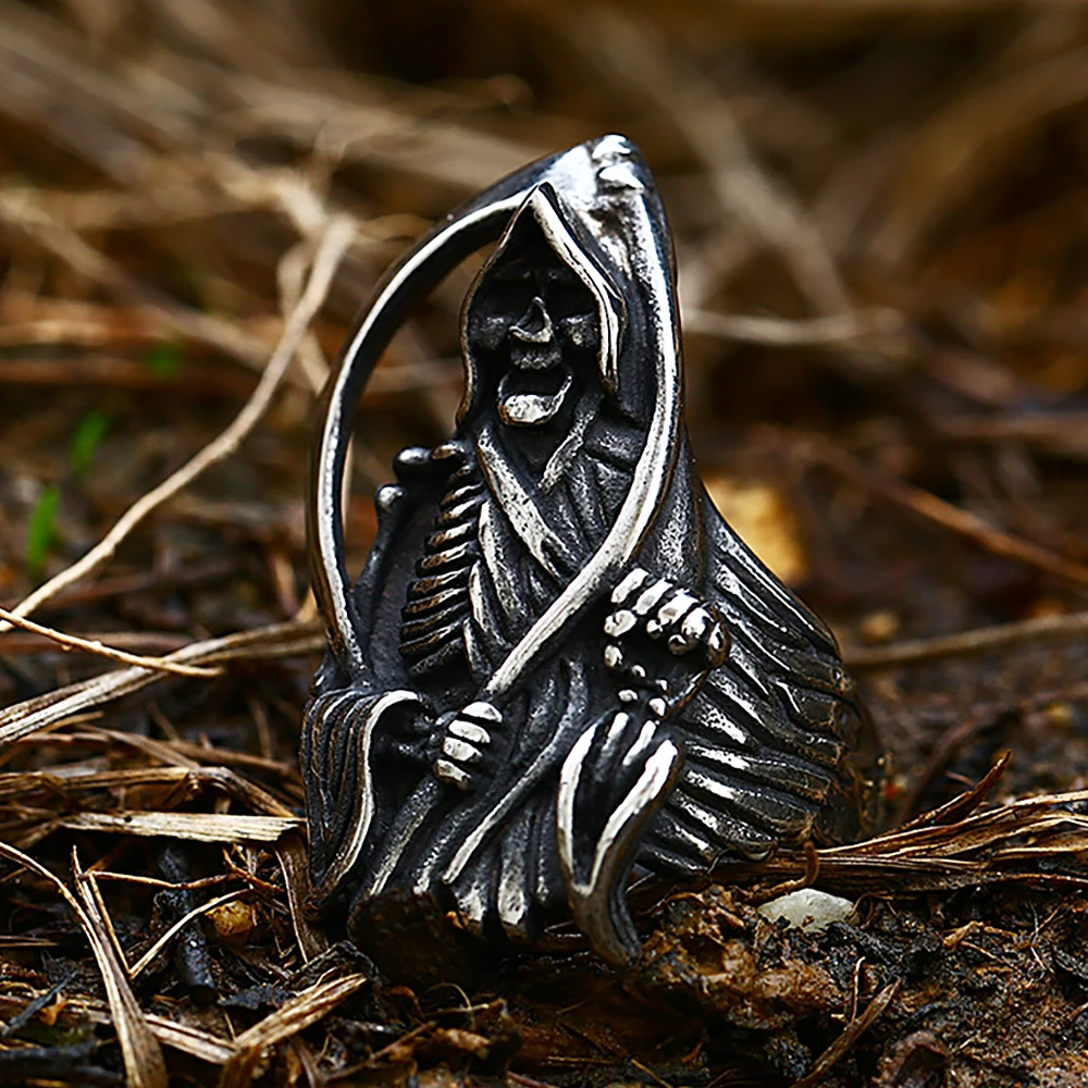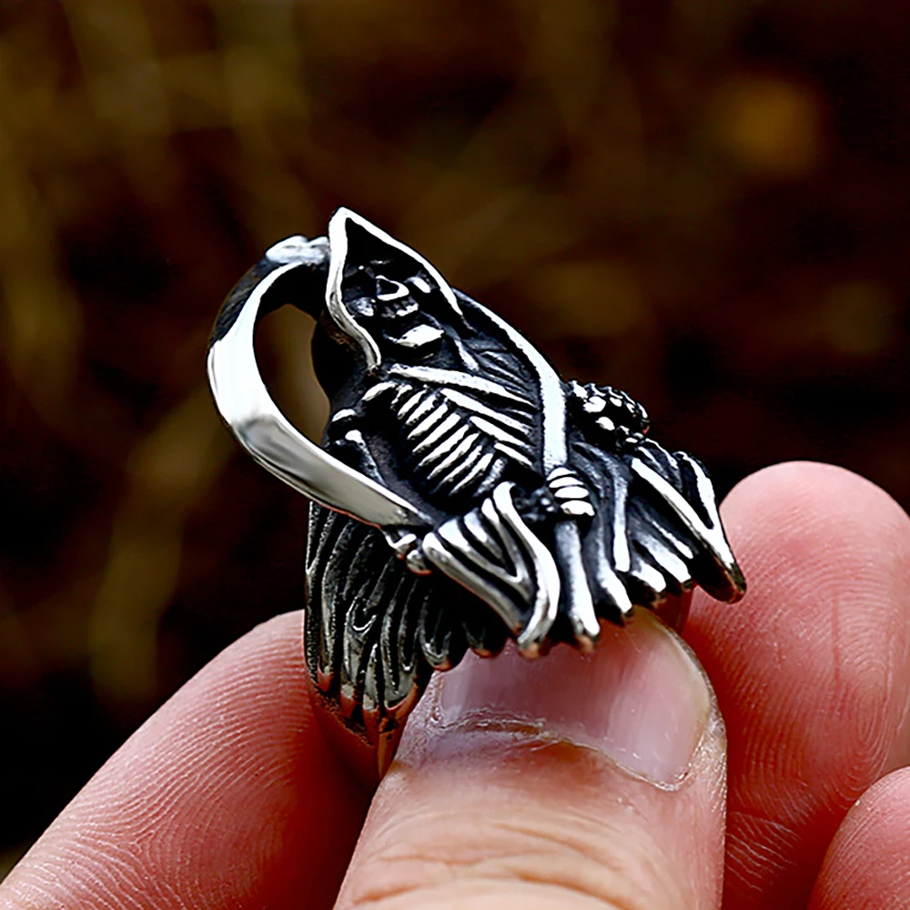 Name: Vintage Unique Grim Reaper Skull Ring for Men Gothic 316L Stainless Steel Death Skull Rings Cool Domineering Jewelry Wholesale