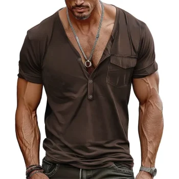 Yaz Aylarında Trendy Erkek Tişörtleri Üst Düzey Düz Renk Büyük Beden Günlük Kısa Kollu Henry Gömlek